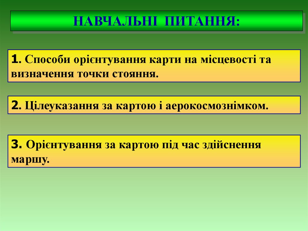 НАВЧАЛЬНІ ПИТАННЯ:1. Способи орієнтування карти на місцевості та
