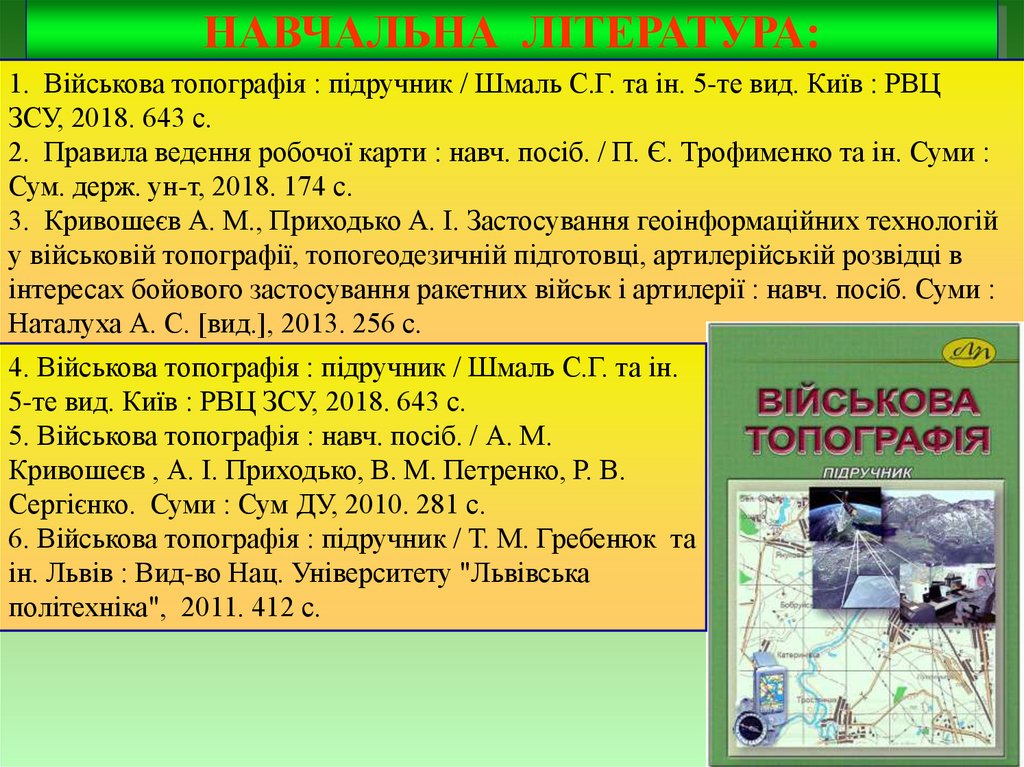 НАВЧАЛЬНА ЛІТЕРАТУРА:1. Військова топографія : підручник / Шмаль С.Г. та ін. 5-те вид. Київ : РВЦ