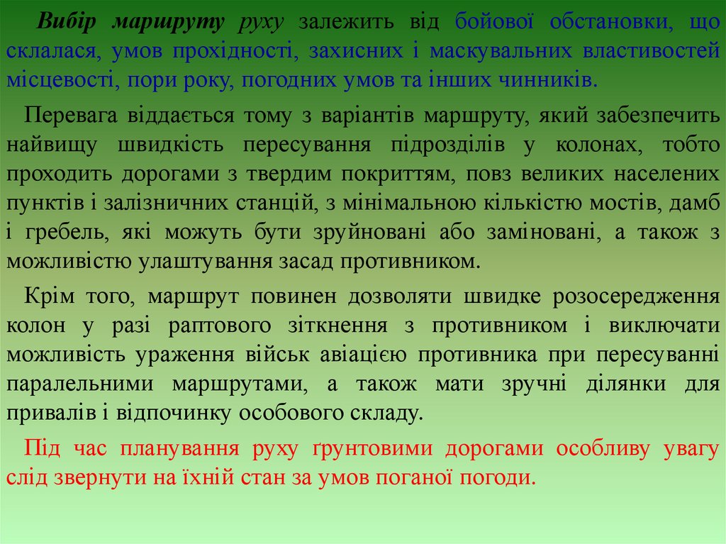 Вибір маршруту руху залежить від бойової обстановки, щосклалася, умов прохідності, захисних і маскувальних властивостей