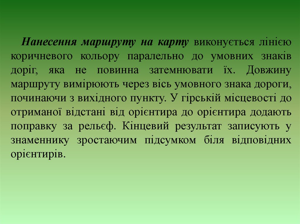 Нанесення маршруту на карту виконується лінієюкоричневого кольору паралельно до умовних знаків