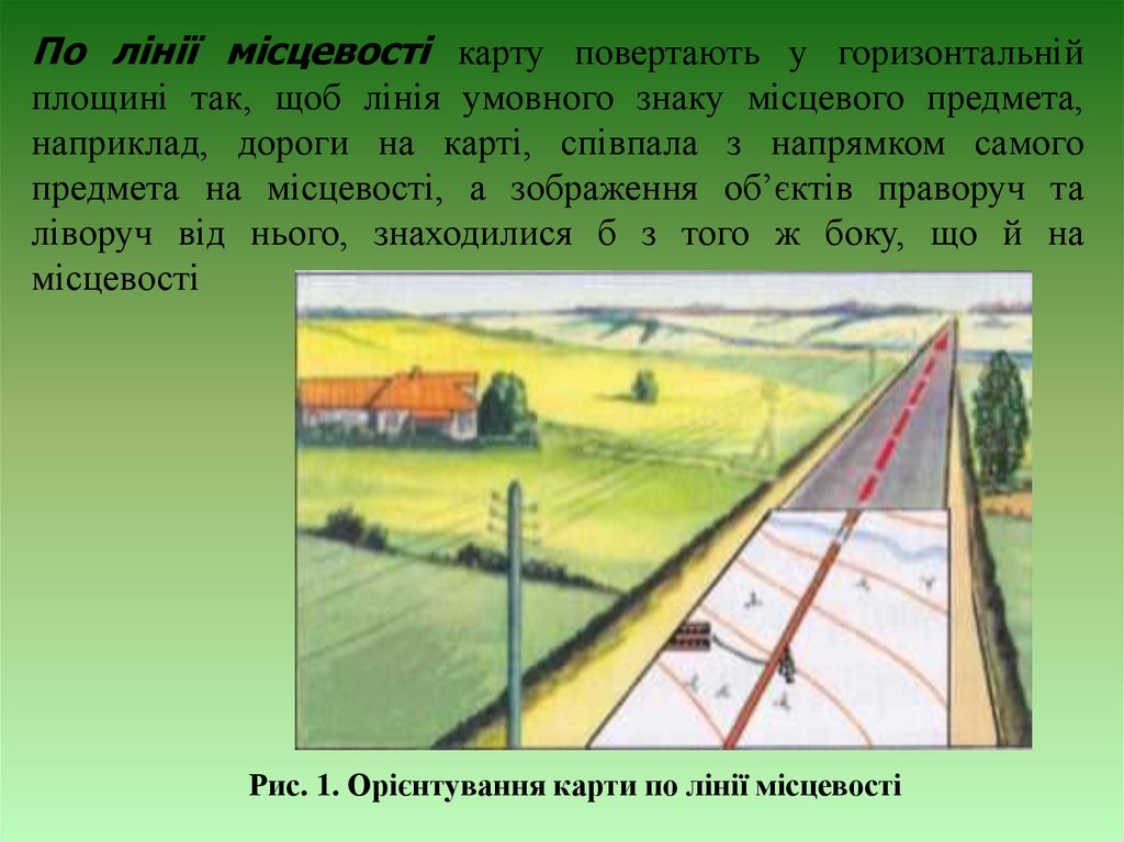 По лінії місцевості карту повертають у горизонтальнійплощині так, щоб лінія умовного знаку місцевого предмета,