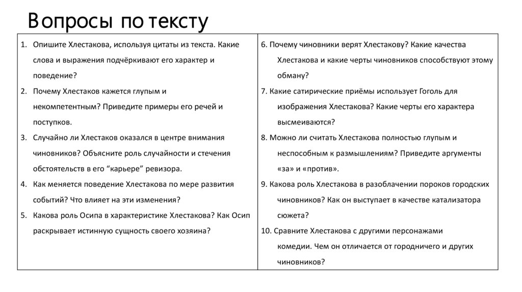 В опросы по тексту1. Опишите Хлестакова, используя цитаты из текста. Какие