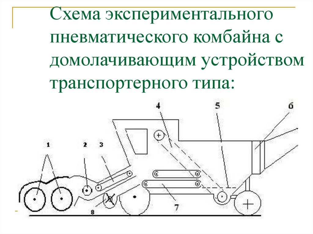 1-очесывающие барабаны; 2-зерновой шнек; 3наклонный транспортер; 4- зерновой элеватор;5-сепарирующая часть; 6, 8-вентиляторы,