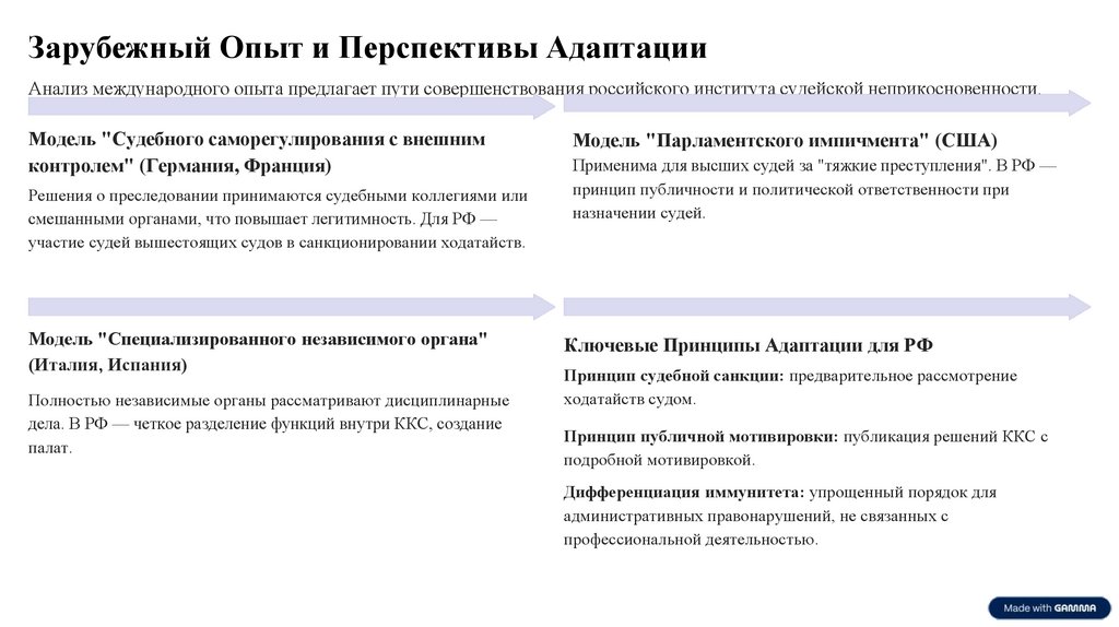 Зарубежный Опыт и Перспективы АдаптацииАнализ международного опыта предлагает пути совершенствования российского института судейской неприкосновенности.
