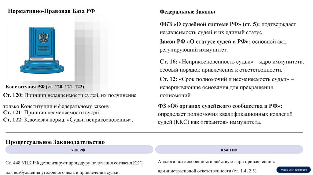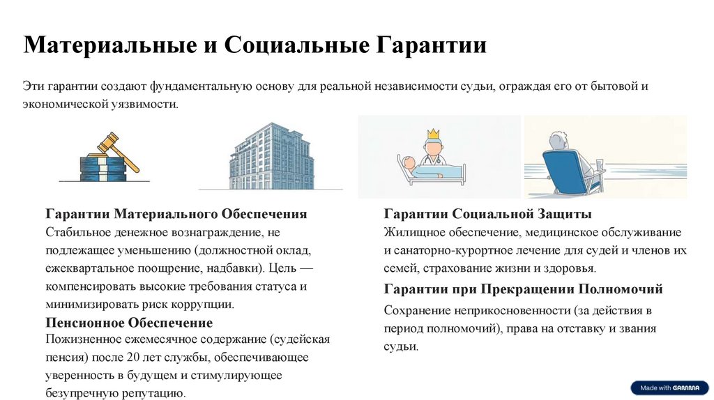 Материальные и Социальные ГарантииЭти гарантии создают фундаментальную основу для реальной независимости судьи, ограждая его от бытовой и