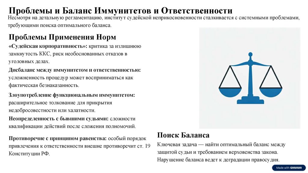 Проблемы и Баланс Иммунитетов и ОтветственностиНесмотря на детальную регламентацию, институт судейской неприкосновенности сталкивается с системными проблемами,