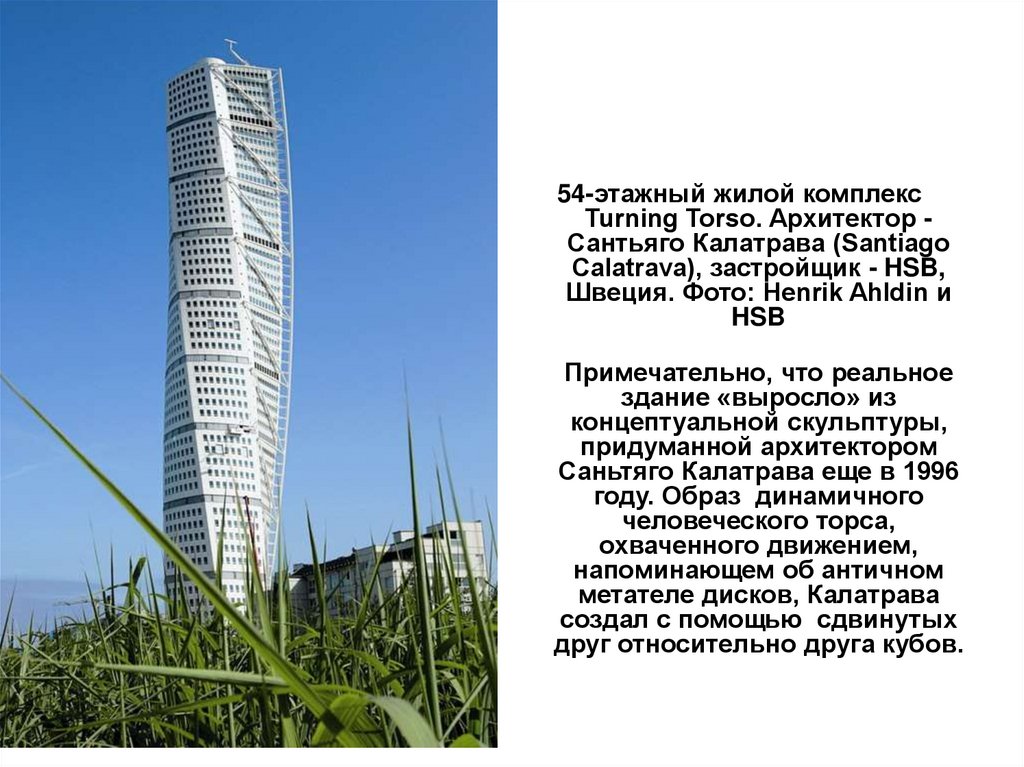 54-этажный жилой комплексTurning Torso. Архитектор Сантьяго Калатрава (Santiago