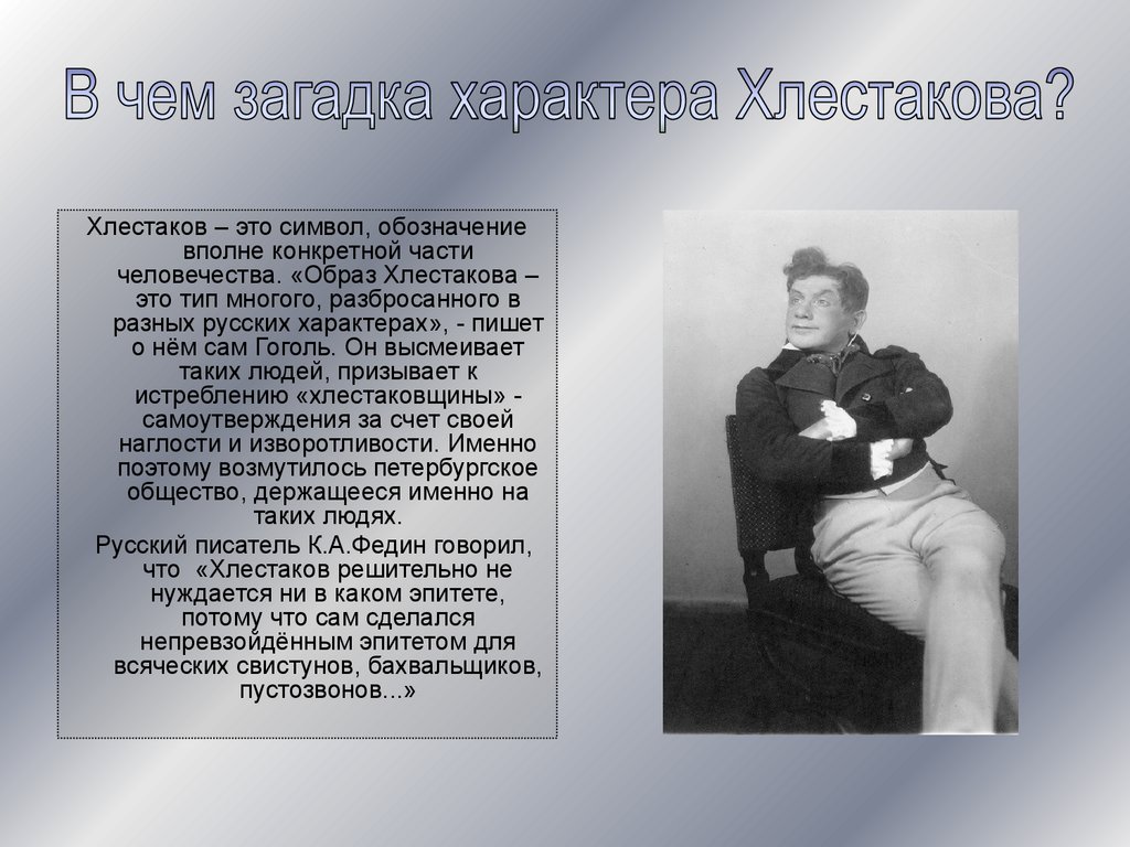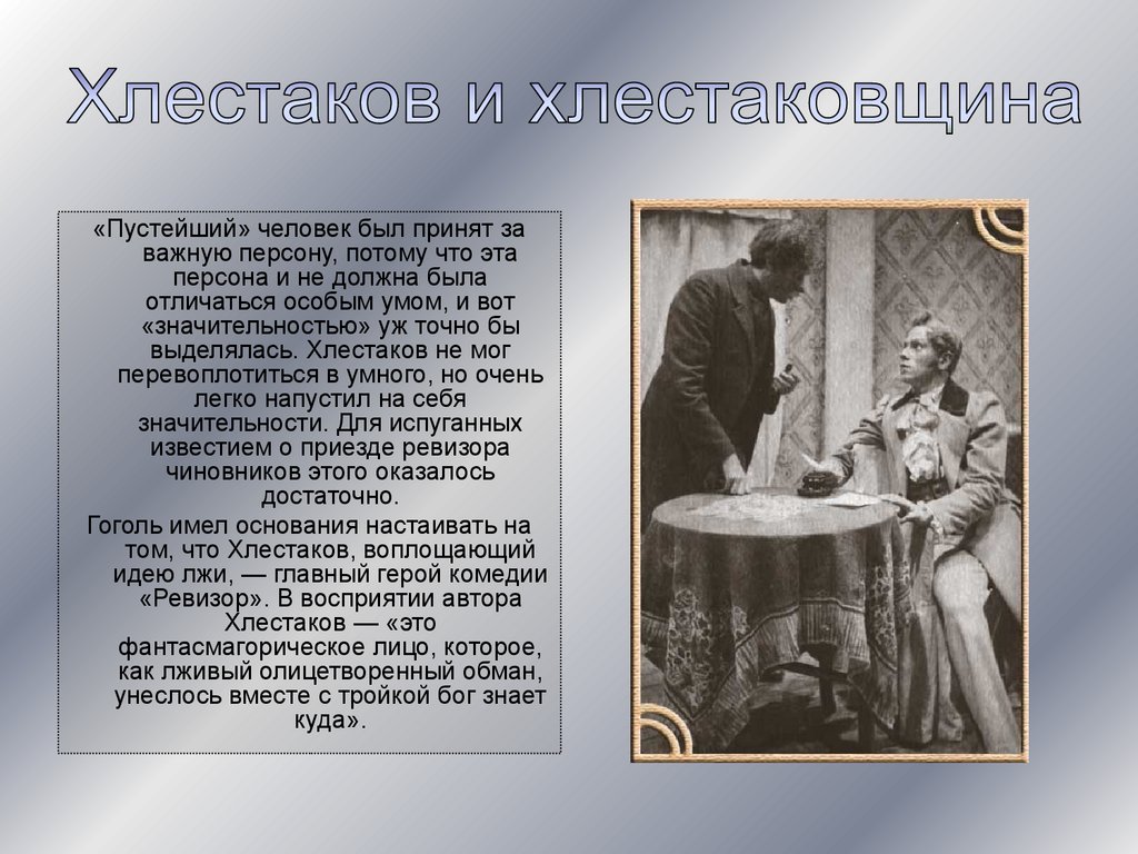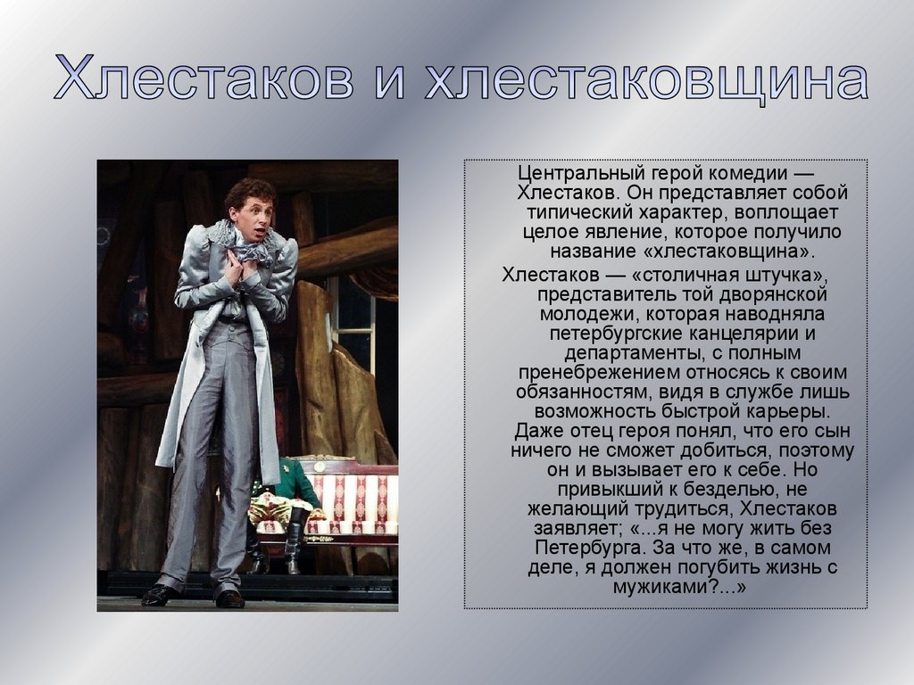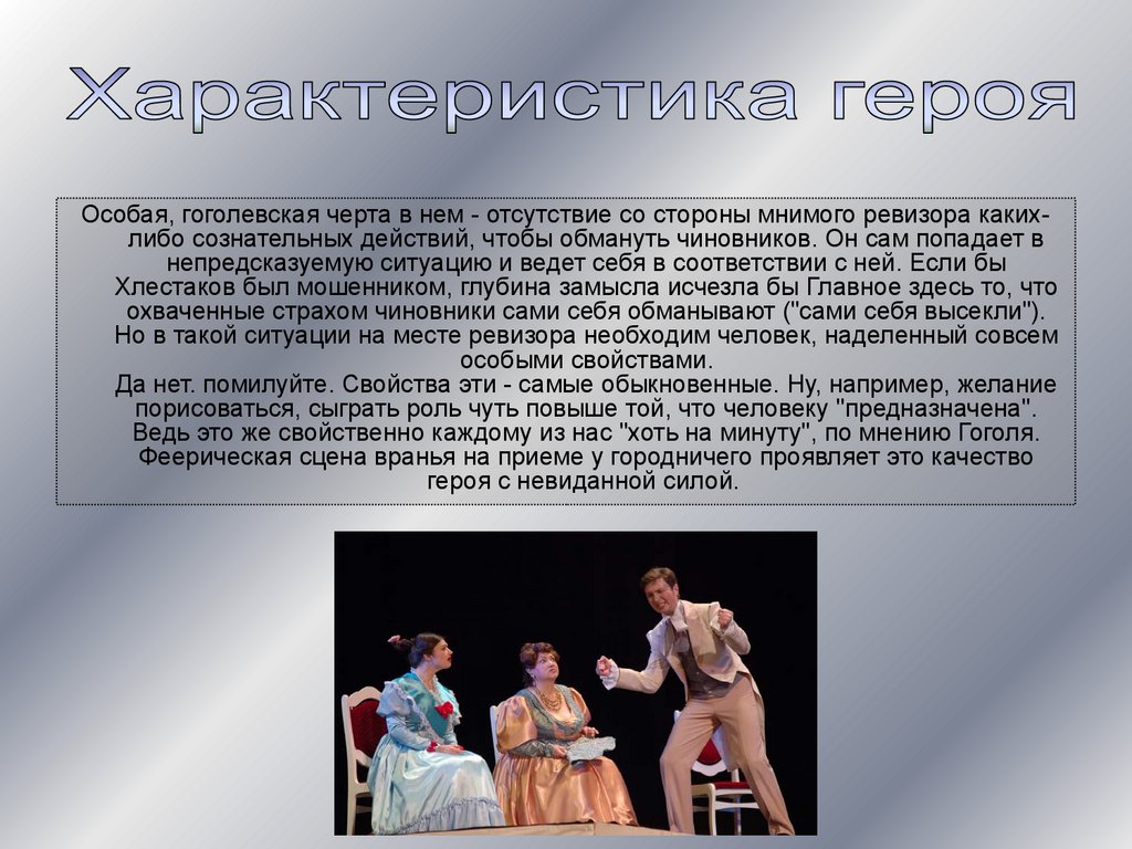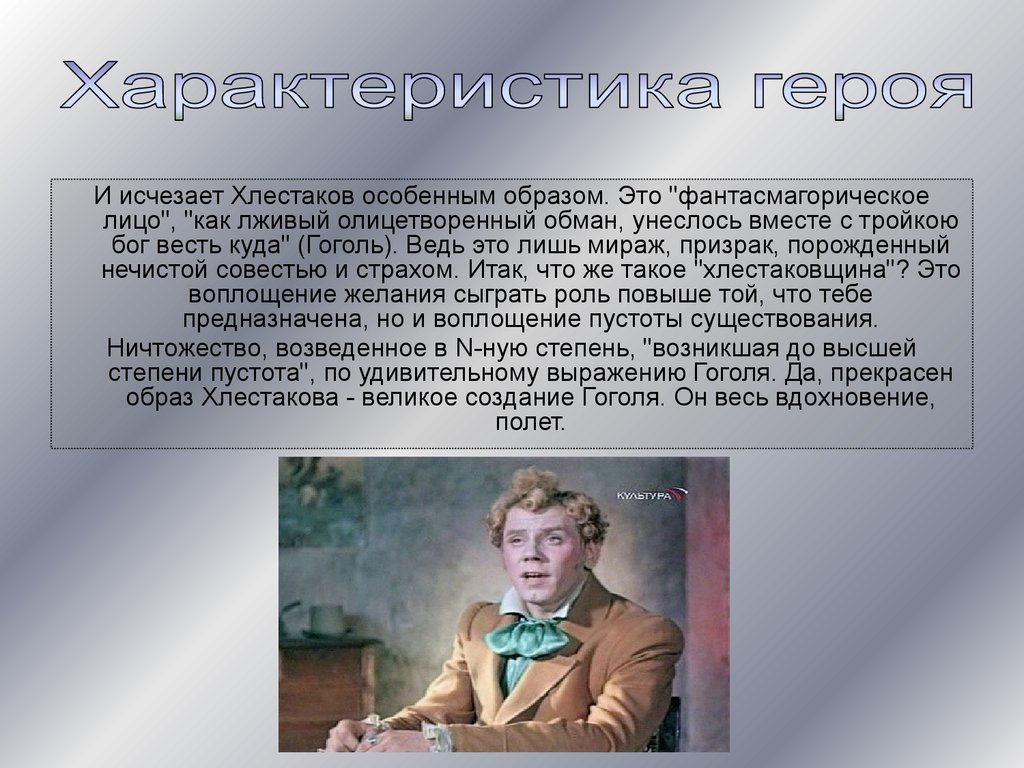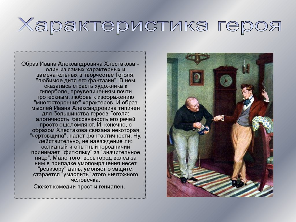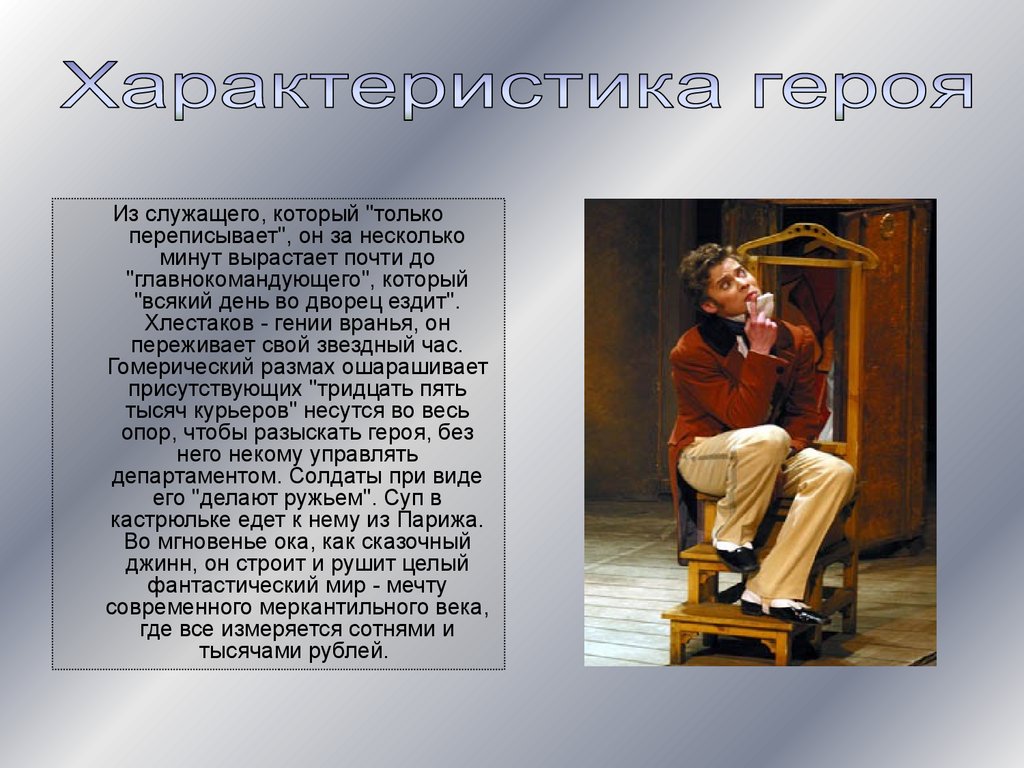 Центральный герой комедии —Хлестаков. Он представляет собой