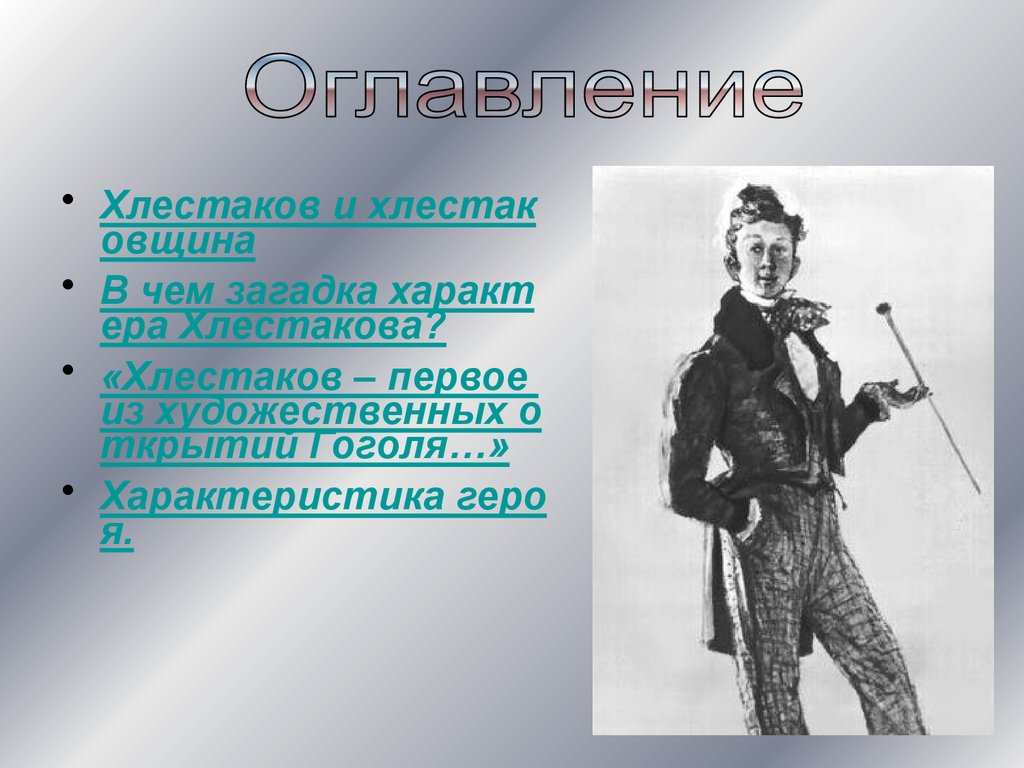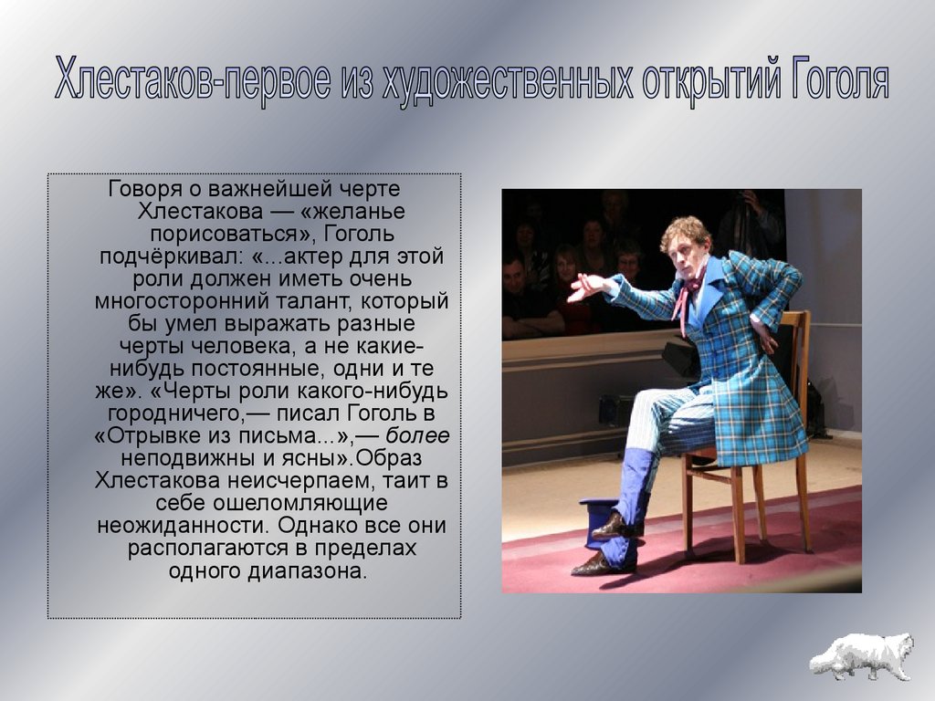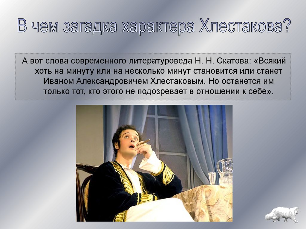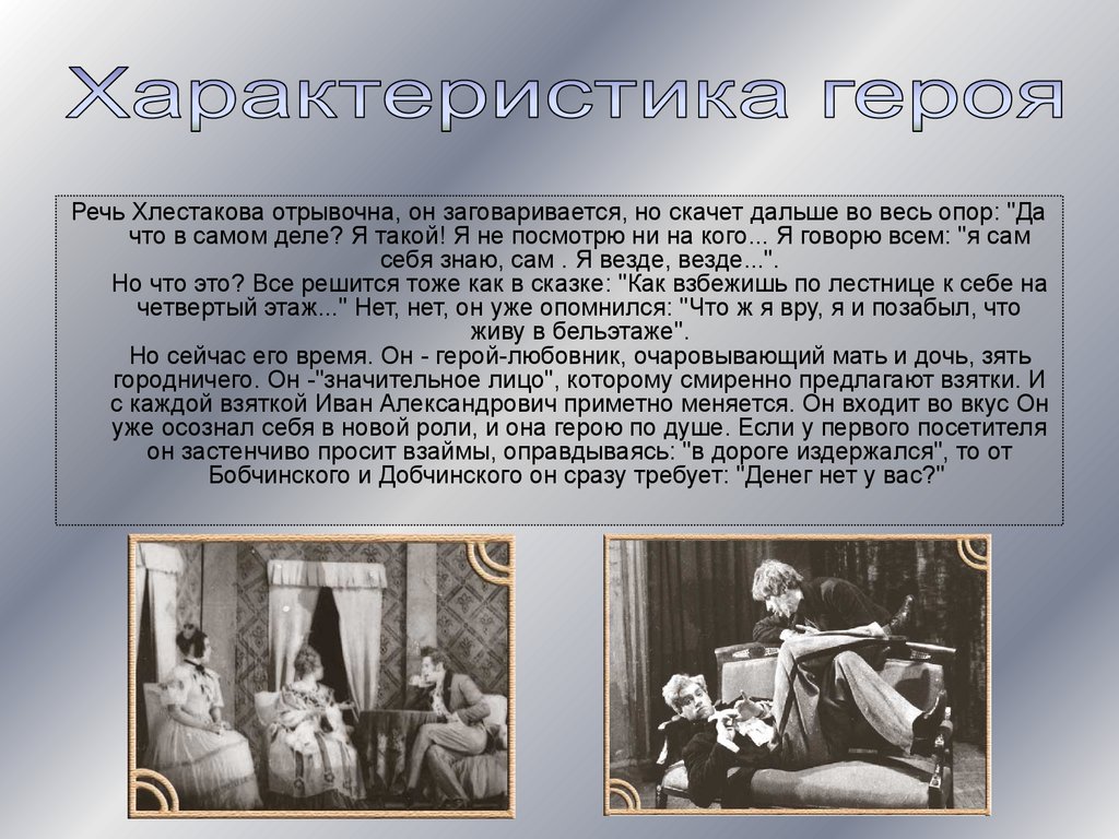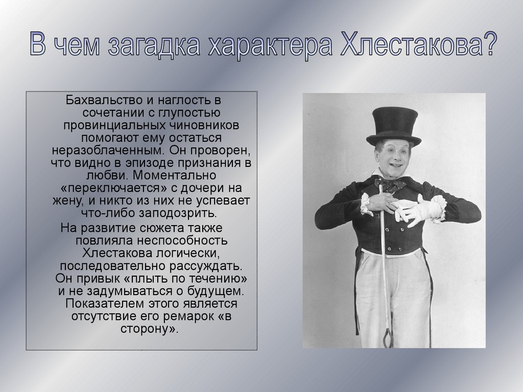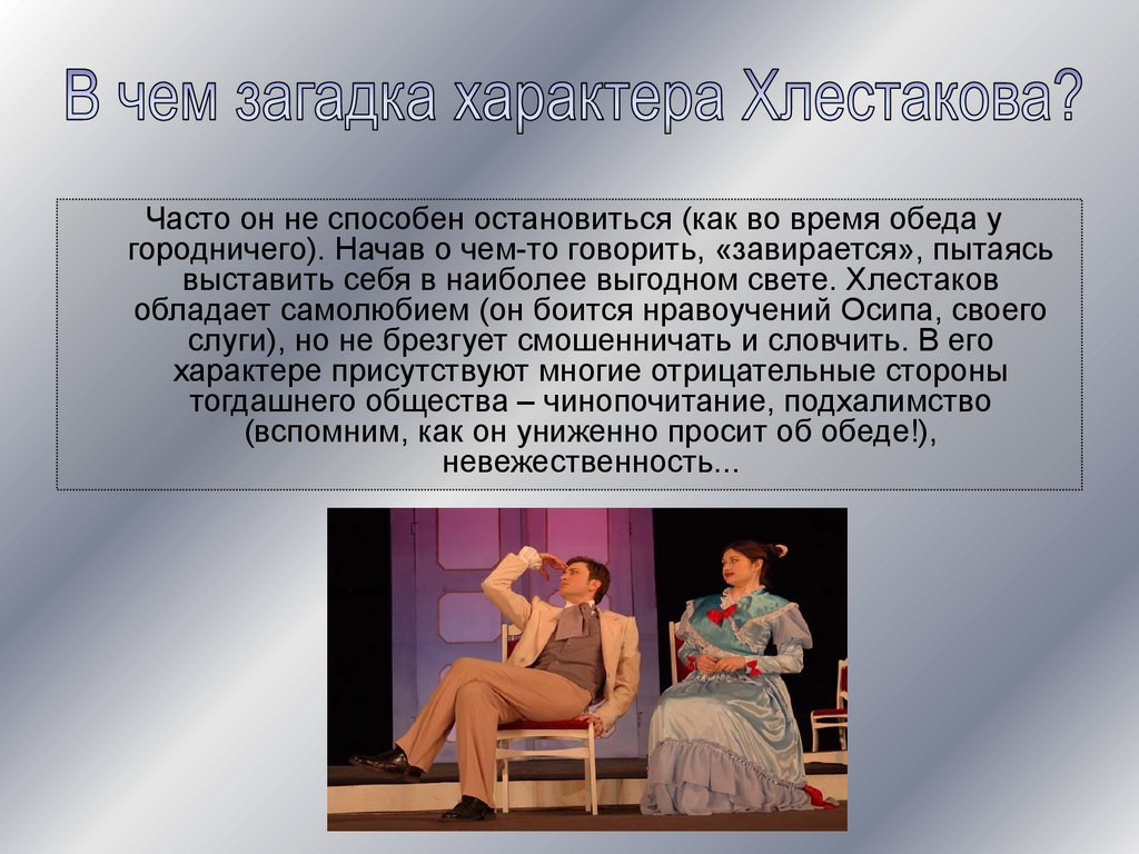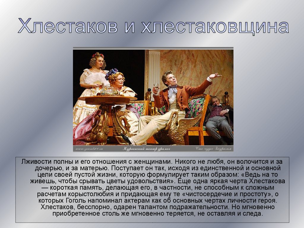 Центральный герой комедии —Хлестаков. Он представляет собой