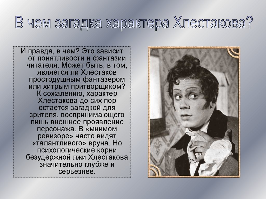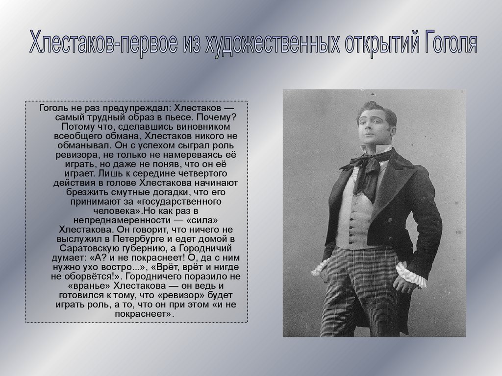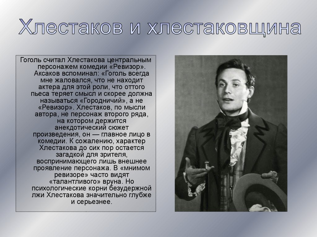 Гоголь считал Хлестакова центральнымперсонажем комедии «Ревизор».