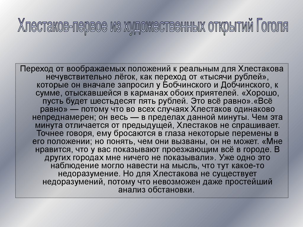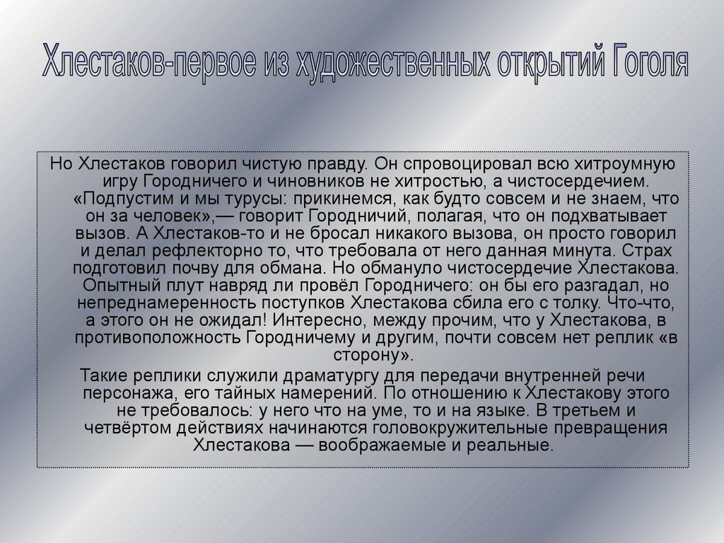 Хлестаков был мошенником, глубина замысла исчезла бы Главное здесь то, что