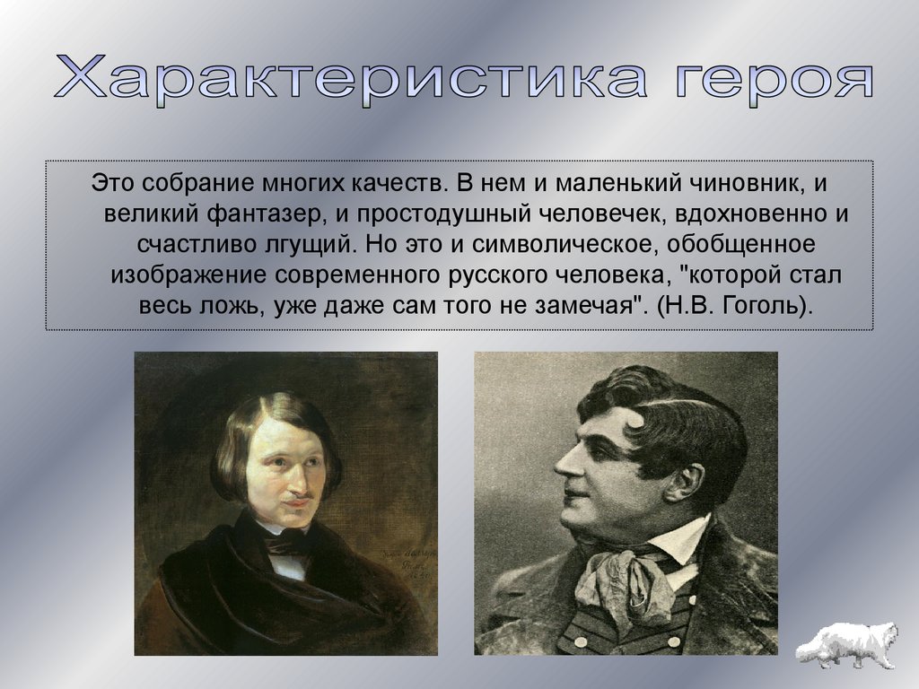 Это собрание многих качеств. В нем и маленький чиновник, ивеликий фантазер, и простодушный человечек, вдохновенно и