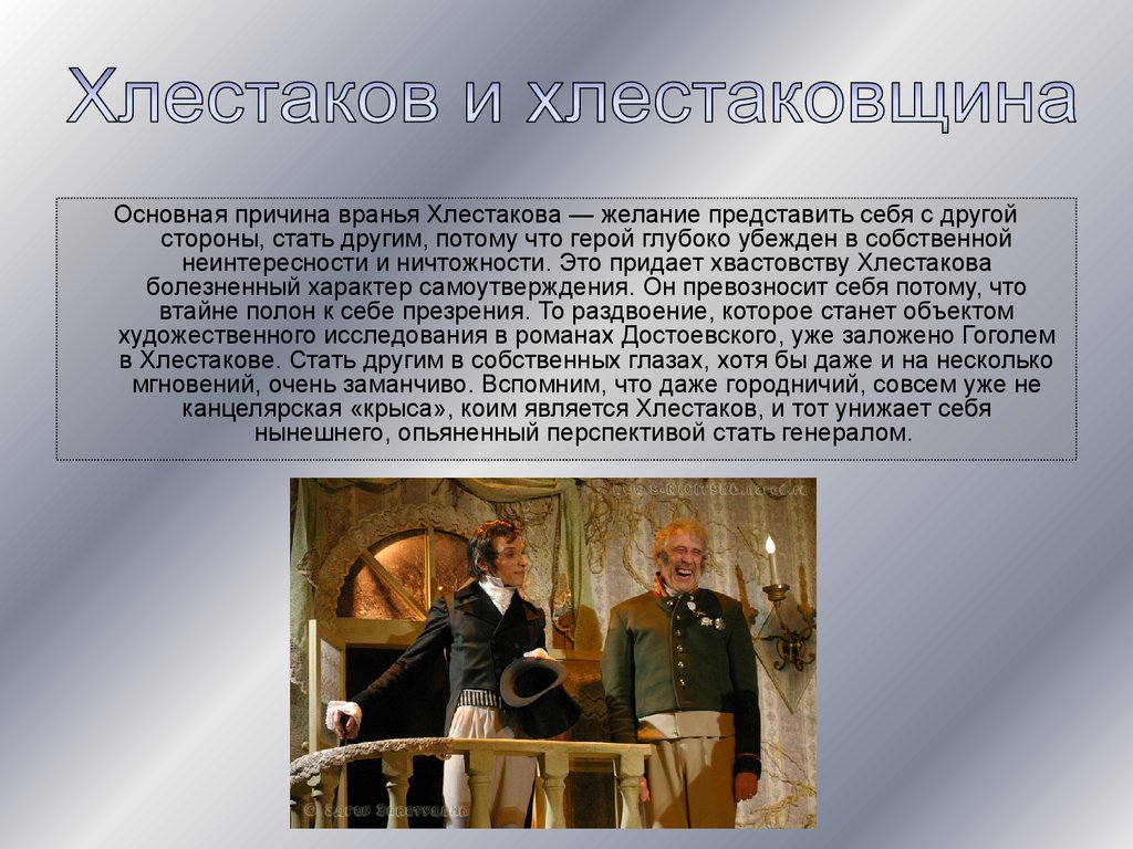 Основная причина вранья Хлестакова — желание представить себя с другойстороны, стать другим, потому что герой глубоко убежден в собственной