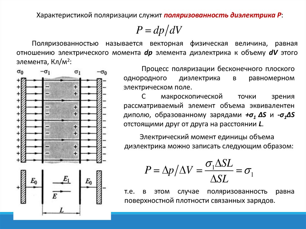Характеристикой поляризации служит поляризованность диэлектрика Р:P dp dV