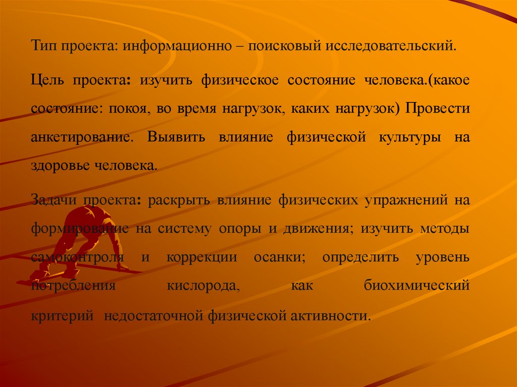 Тип проекта: информационно – поисковый исследовательский.Цель проекта: изучить физическое состояние человека.(какое