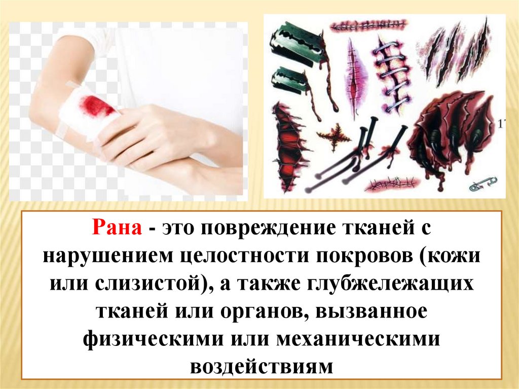 Рана - это повреждение тканей снарушением целостности покровов (кожи