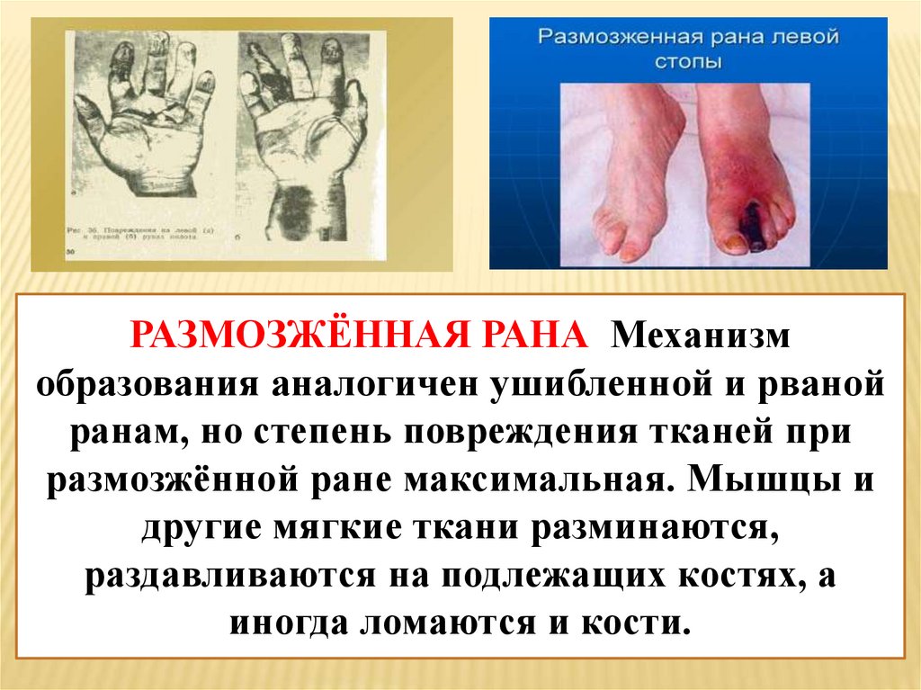 РАЗМОЗЖЁННАЯ РАНА Механизмобразования аналогичен ушибленной и рваной