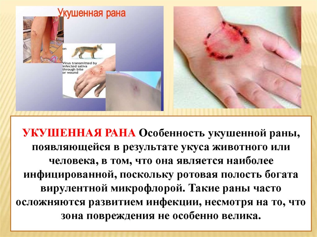 УКУШЕННАЯ РАНА Особенность укушенной раны,появляющейся в результате укуса животного или