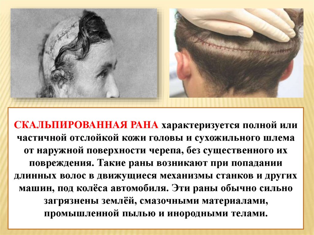 СКАЛЬПИРОВАННАЯ РАНА характеризуется полной иличастичной отслойкой кожи головы и сухожильного шлема