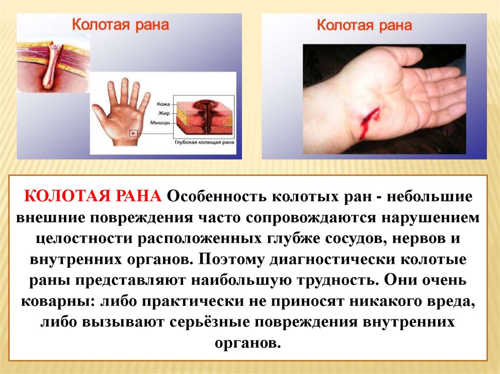 КОЛОТАЯ РАНА Особенность колотых ран - небольшиевнешние повреждения часто сопровождаются нарушением
