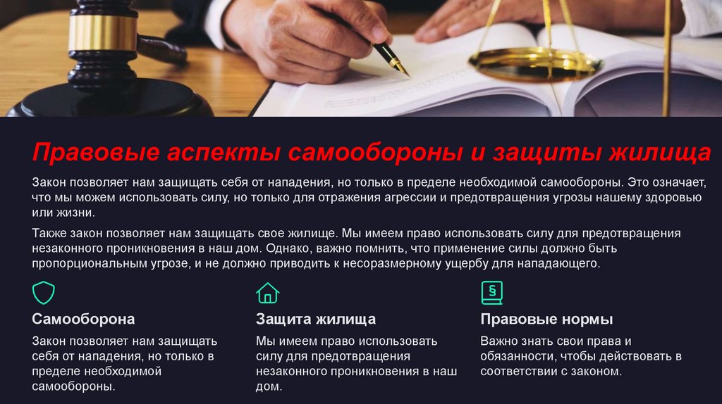 Правовые аспекты самообороны и защиты жилищаЗакон позволяет нам защищать себя от нападения, но только в пределе необходимой самообороны. Это означает,