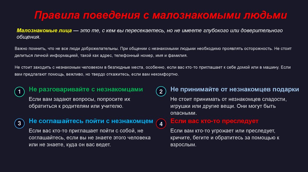 Важно помнить, что не все люди доброжелательны. При общении с незнакомыми людьми необходимо проявлять осторожность. Не стоит