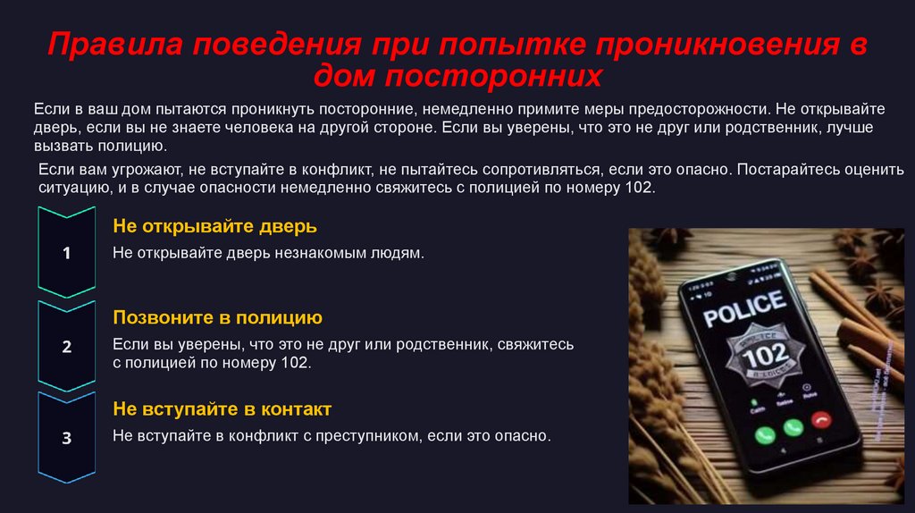 Если в ваш дом пытаются проникнуть посторонние, немедленно примите меры предосторожности. Не открывайте