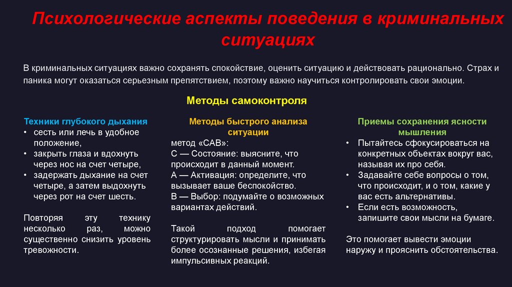 В криминальных ситуациях важно сохранять спокойствие, оценить ситуацию и действовать рационально. Страх и