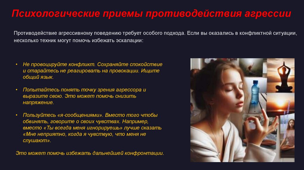 Психологические приемы противодействия агрессииПротиводействие агрессивному поведению требует особого подхода. Если вы оказались в конфликтной ситуации,