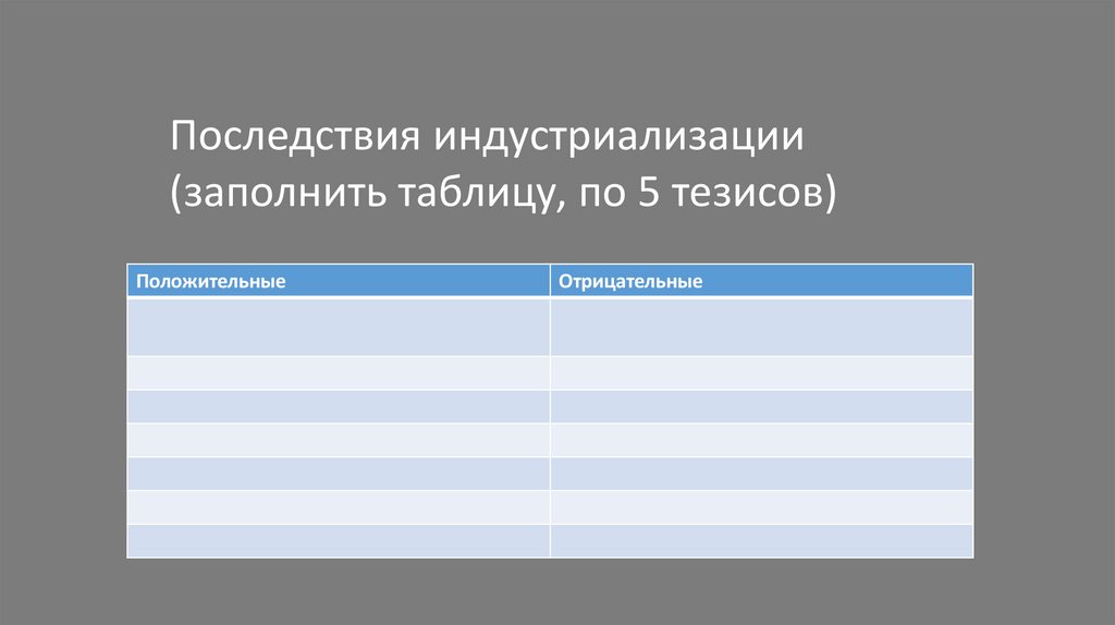 Последствия индустриализации(заполнить таблицу, по 5 тезисов)