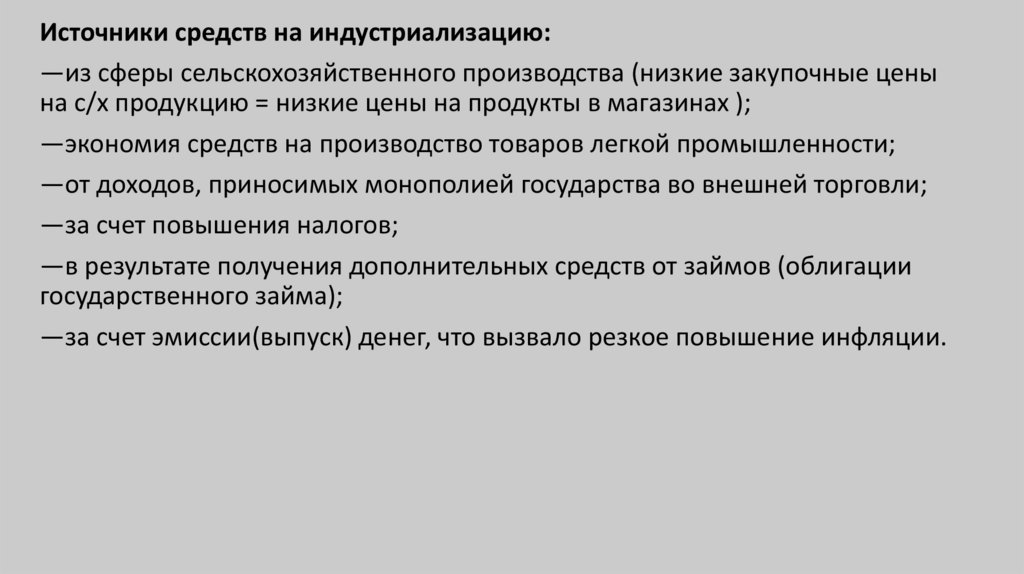 Источники средств на индустриализацию:—из сферы сельскохозяйственного производства (низкие закупочные цены
