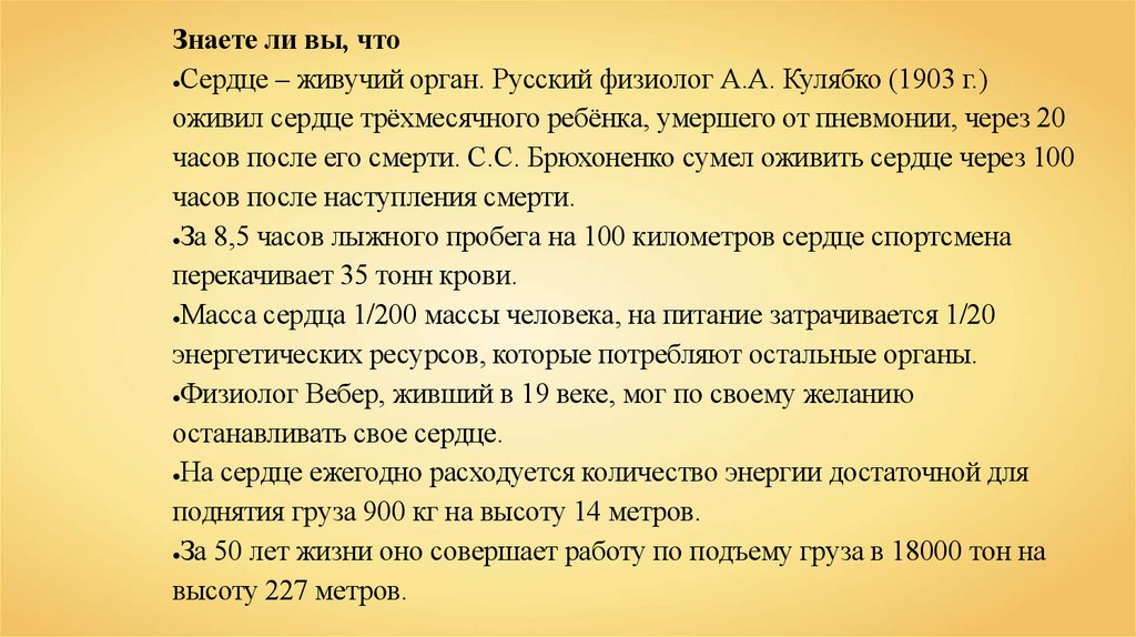 Знаете ли вы, чтоСердце – живучий орган. Русский физиолог А.А. Кулябко (1903 г.)