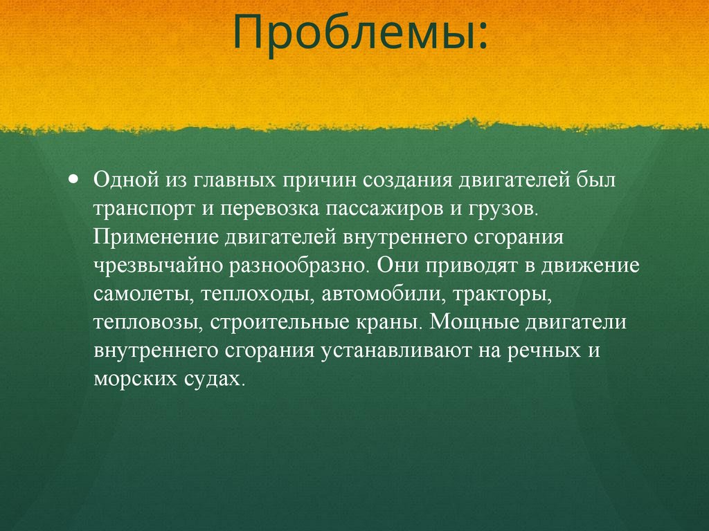 Проблемы:Одной из главных причин создания двигателей был