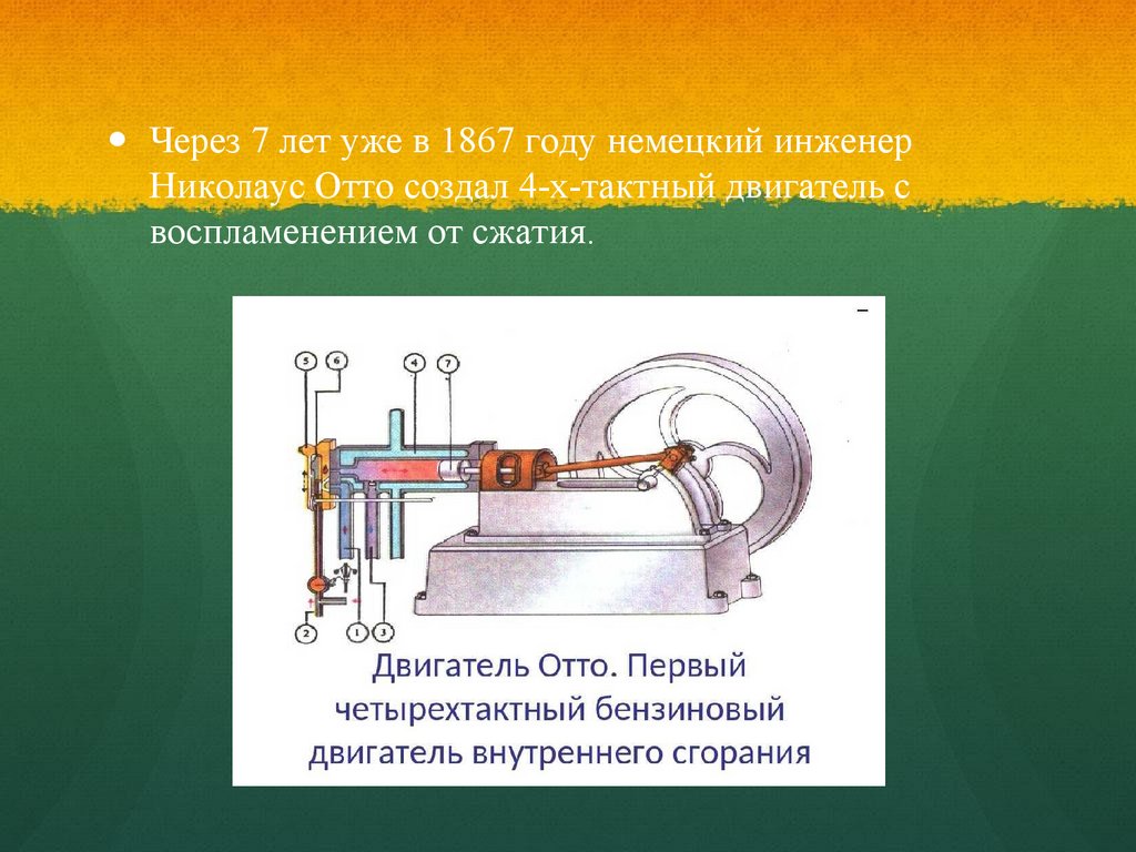 Через 7 лет уже в 1867 году немецкий инженерНиколаус Отто создал 4-х-тактный двигатель с