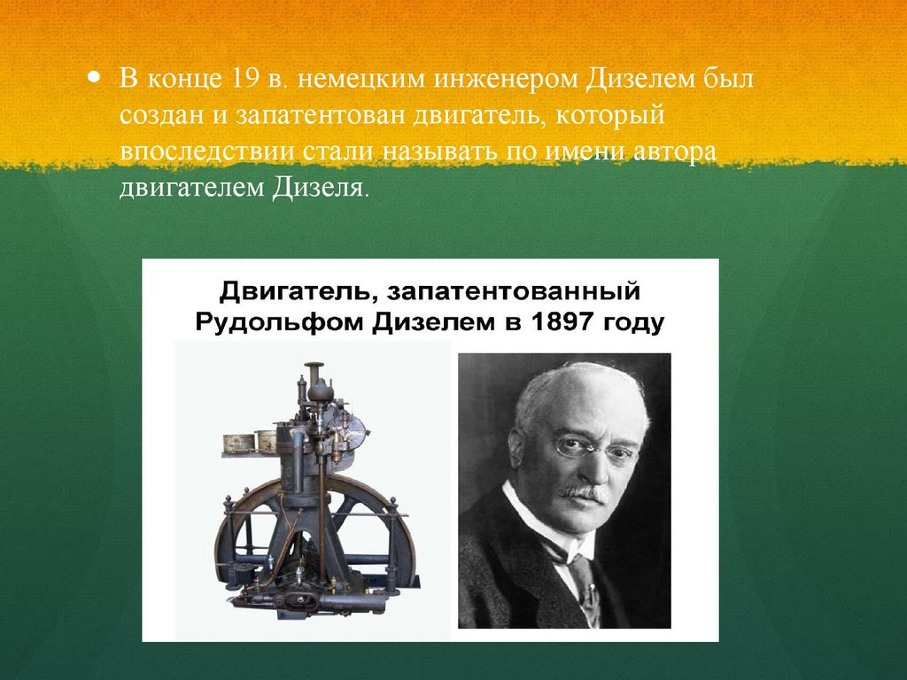 В конце 19 в. немецким инженером Дизелем былсоздан и запатентован двигатель, который