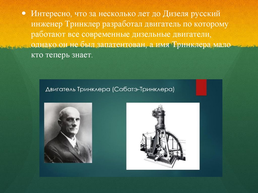 Интересно, что за несколько лет до Дизеля русскийинженер Тринклер разработал двигатель по которому