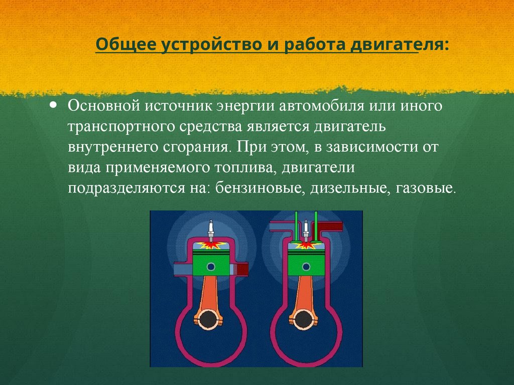 Общее устройство и работа двигателя:Основной источник энергии автомобиля или иного