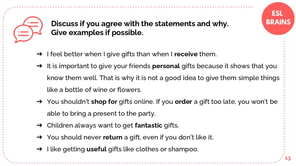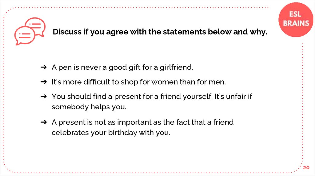 Discuss if you agree with the statements below and why.➔ A pen is never a good gift for a girlfriend.