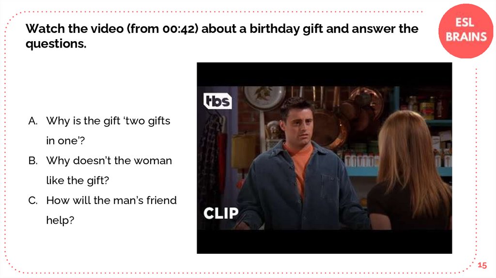 Watch the video (from 00:42) about a birthday gift and answer thequestions.