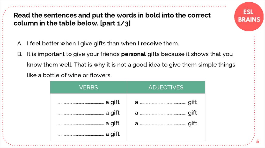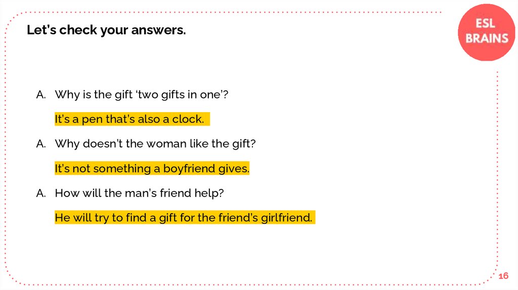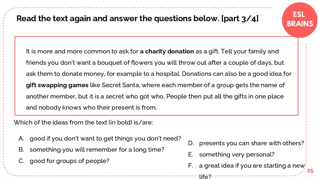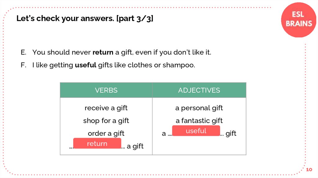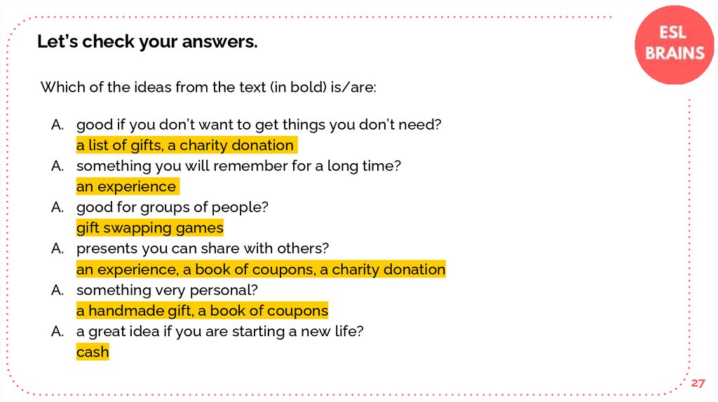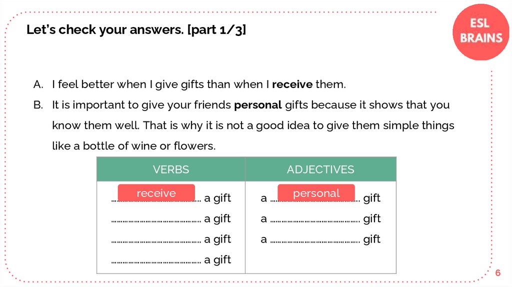 Let’s check your answers. [part 1/3]A. I feel better when I give gifts than when I receive them.