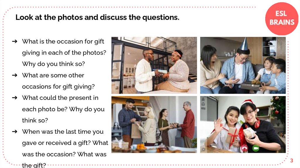 Look at the photos and discuss the questions.➔ What is the occasion for gift