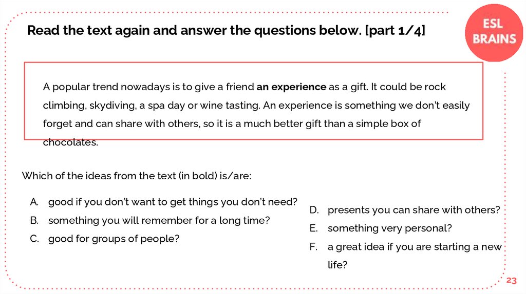 Read the text again and answer the questions below. [part 1/4]A popular trend nowadays is to give a friend an experience as a gift. It could be rock