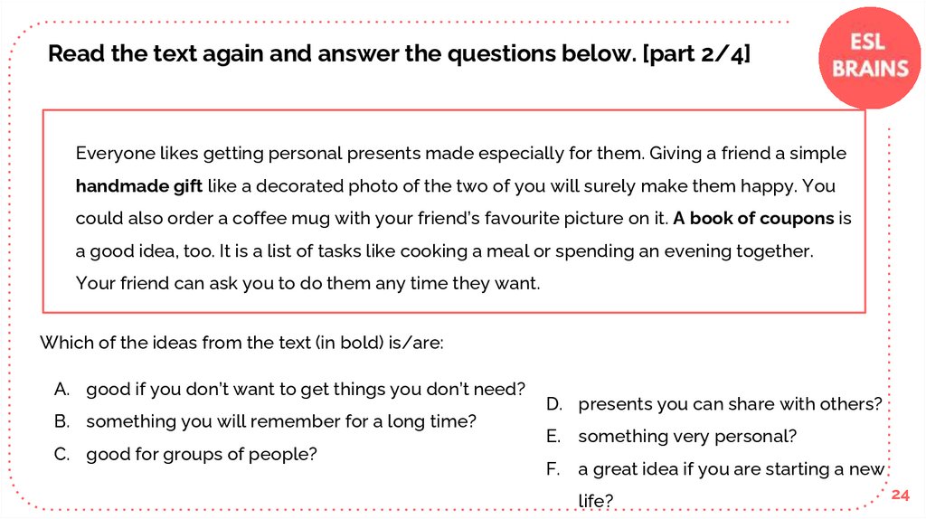 Read the text again and answer the questions below. [part 2/4]Everyone likes getting personal presents made especially for them. Giving a friend a simple