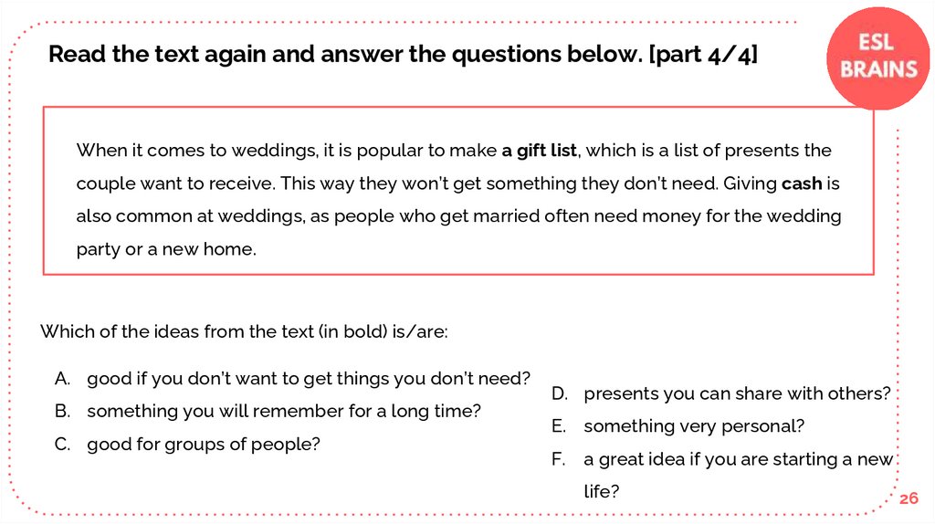 Read the text again and answer the questions below. [part 4/4]When it comes to weddings, it is popular to make a gift list, which is a list of presents the