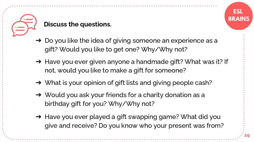 Discuss the questions.➔ Do you like the idea of giving someone an experience as a