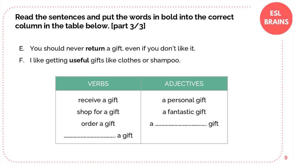 Read the sentences and put the words in bold into the correctcolumn in the table below. [part 2/3]