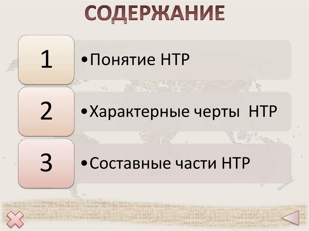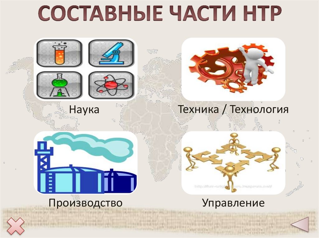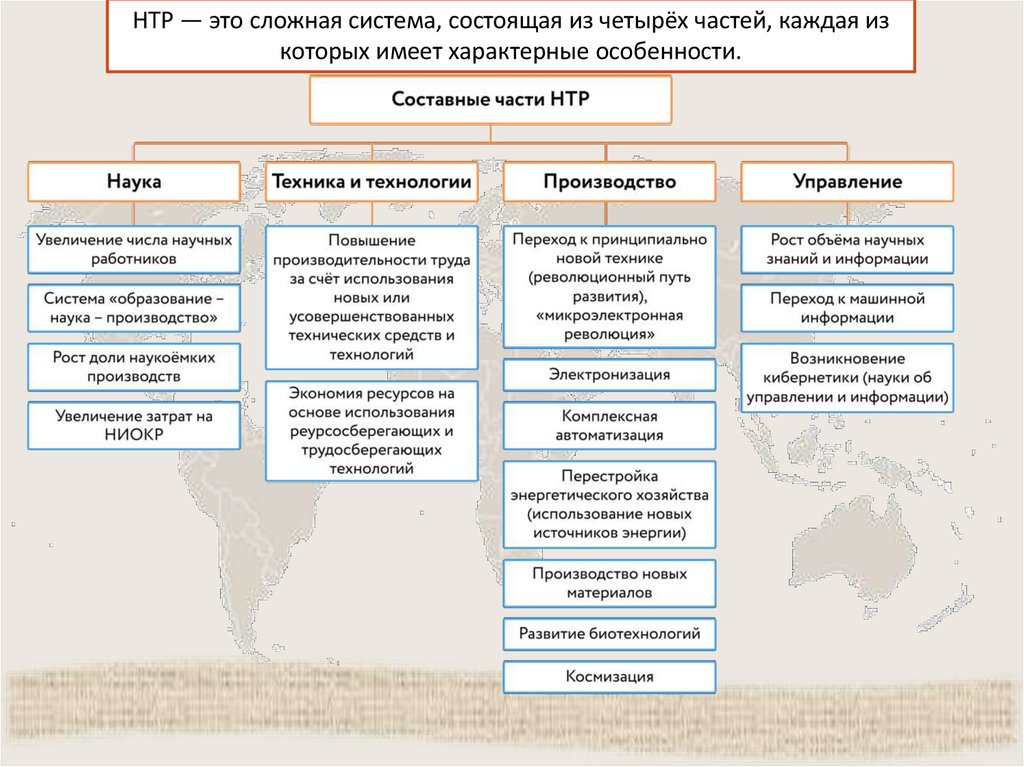 НТР — это сложная система, состоящая из четырёх частей, каждая изкоторых имеет характерные особенности.