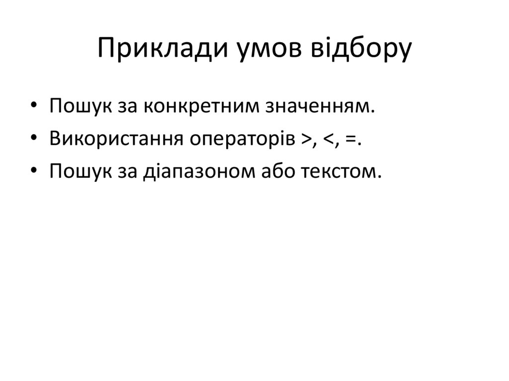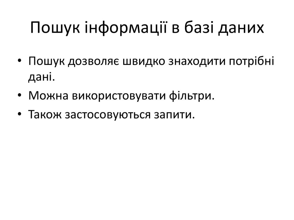 Пошук інформації в базі даних• Пошук дозволяє швидко знаходити потрібні