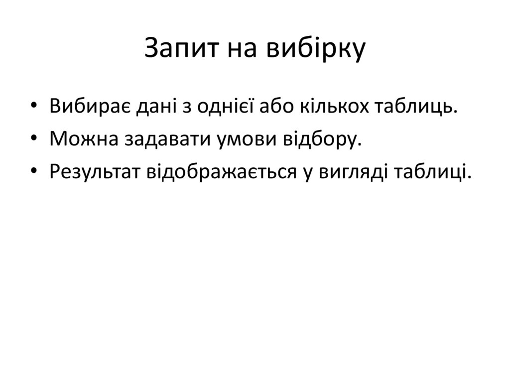 Запит на вибірку• Вибирає дані з однієї або кількох таблиць.
