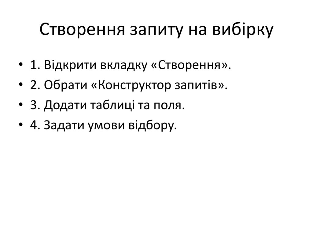 Створення запиту на вибірку• 1. Відкрити вкладку «Створення».